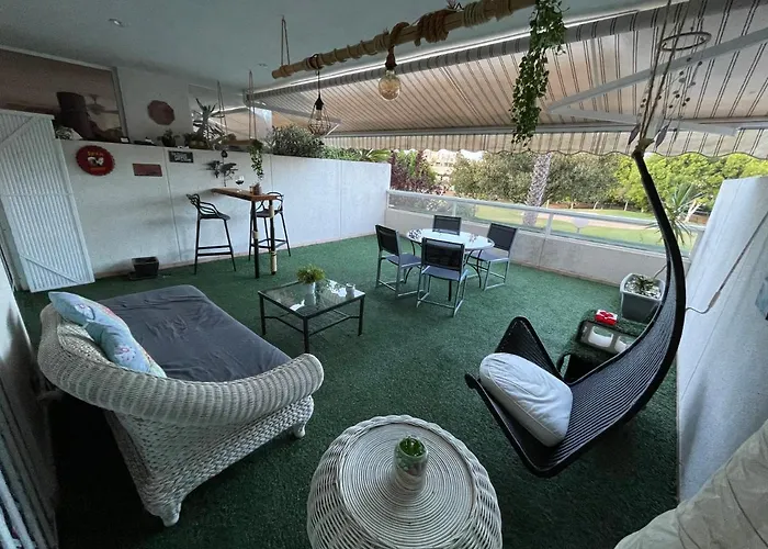 Large Quiet Terrace, Golf Views lägenhet ligger i distriktet San Juan Beach, 1 km från Playa de Albuferetas, och erbjuder solterrass, golfbana och bubbelpool. Gäster kan nå Torre Castillo inom 5 minuters promenad från boendet.